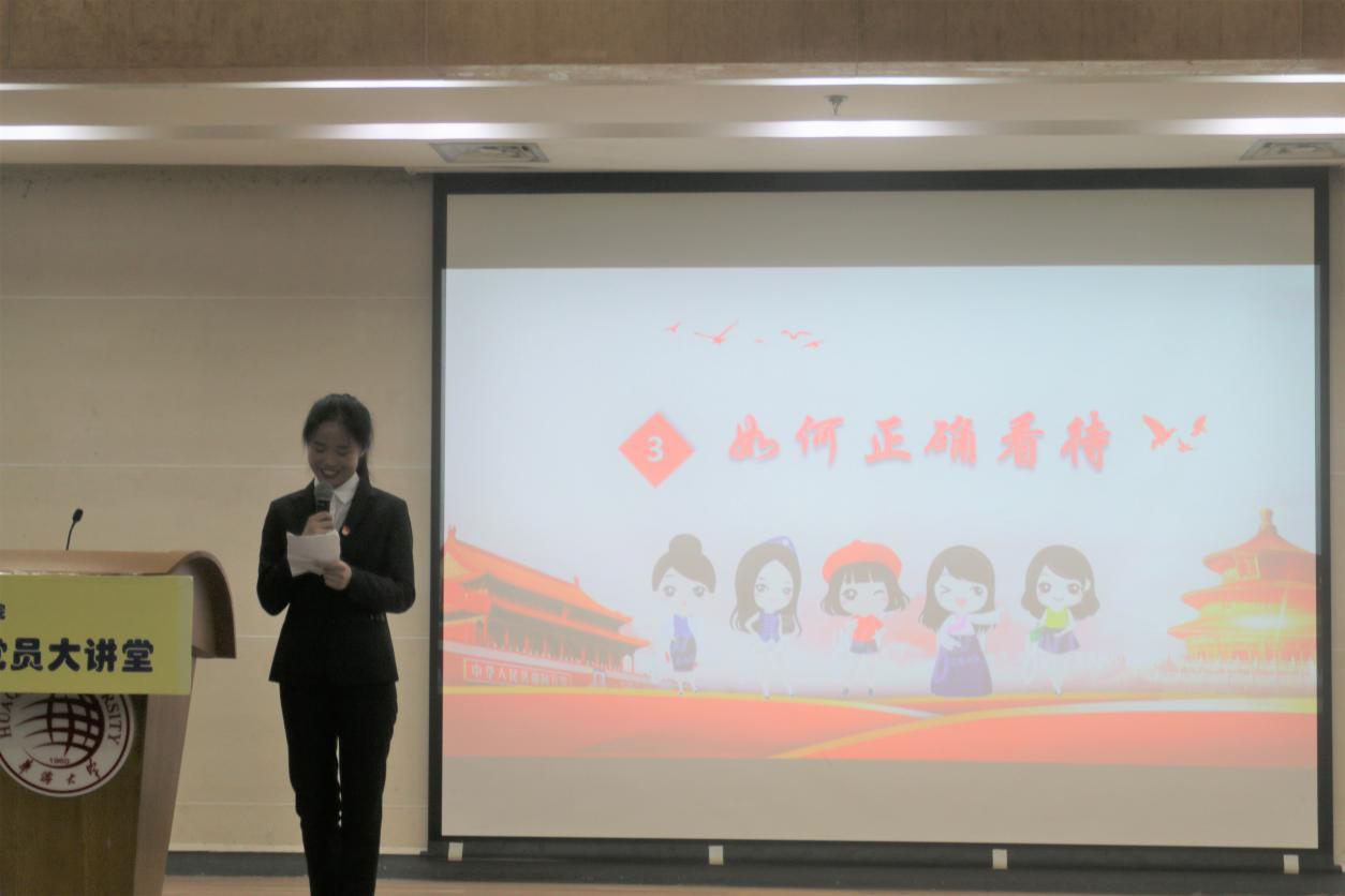 本次学生党员大讲堂以“心系祖国,聚焦两会”为主题,旨在从学生党员的视角向学院师生介绍和宣传党的政策方针。六个学生党支部分别选取了两会中不同的关键词作为主题,用自己的独特方式展现他们的学习所得。生物工程党支部着眼于“一带一路”和中巴关系发展,以小品形式展现了当代中国家庭对中美贸易战的不同看法,体现中国外交崇尚合作共赢的坚定立场。其余四个党支部也分别就我国医疗改革和社会保障体系现状、美国仲裁中兴事件、环境污染严重问题与党员的政治意识这四个方面,利用不同方式向大家展示自己的感想。